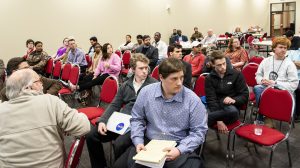Participants at Venture Launch Weekend, an entrepreneurial development program held at the University of Mississippi, listen to a point being made during the presentaitons. Photo courtesy Mabus Agency