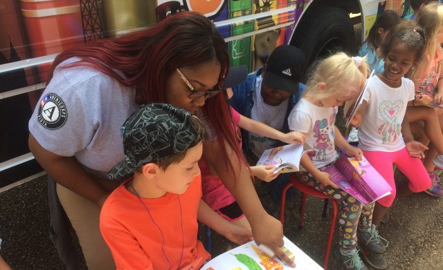 UM social work graduate Armonti Johnson (left) helps children pick out books and read at the LOU mobile library. The New Albany native is a member of the Americorps VISTA program and has served organizations throughout north Mississippi. Submitted photo