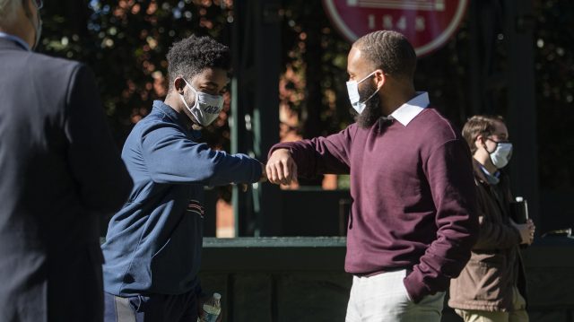 University administrators and first-generation students greet one another at a breakfast honoring first-gen students in the Grove in November 2020. Photo by Logan Kirkland/Ole Miss Digital Imaging Services