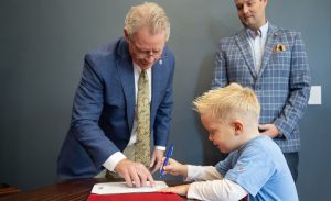 Chancellor Glenn Boyce (left) helps Will Rodgers sign a proclamation declaring him and his three brothers as kid presidents of the university for a weekend in the Lyceum. Andrew Newby (right), assistant director of the UM Office of Veteran and Military Services, helped set up the weekend as a surprise for Will and his brothers. Photo by Thomas Graning/Ole Miss Digital Imaging Services