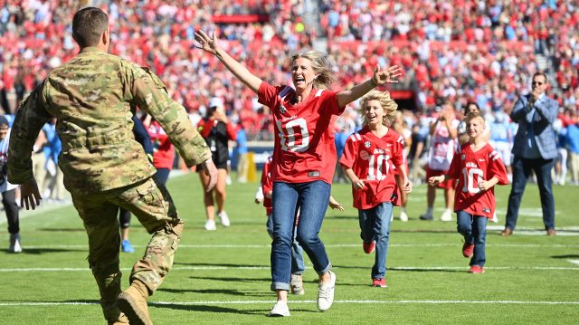 “Please welcome to the field the Rodgers family, who are the recipients of Ole Miss wish,” announcer Glen Waddle said. “Their dada, Kyle Rodgers, is serving a 10-month deployment in Egypt.”