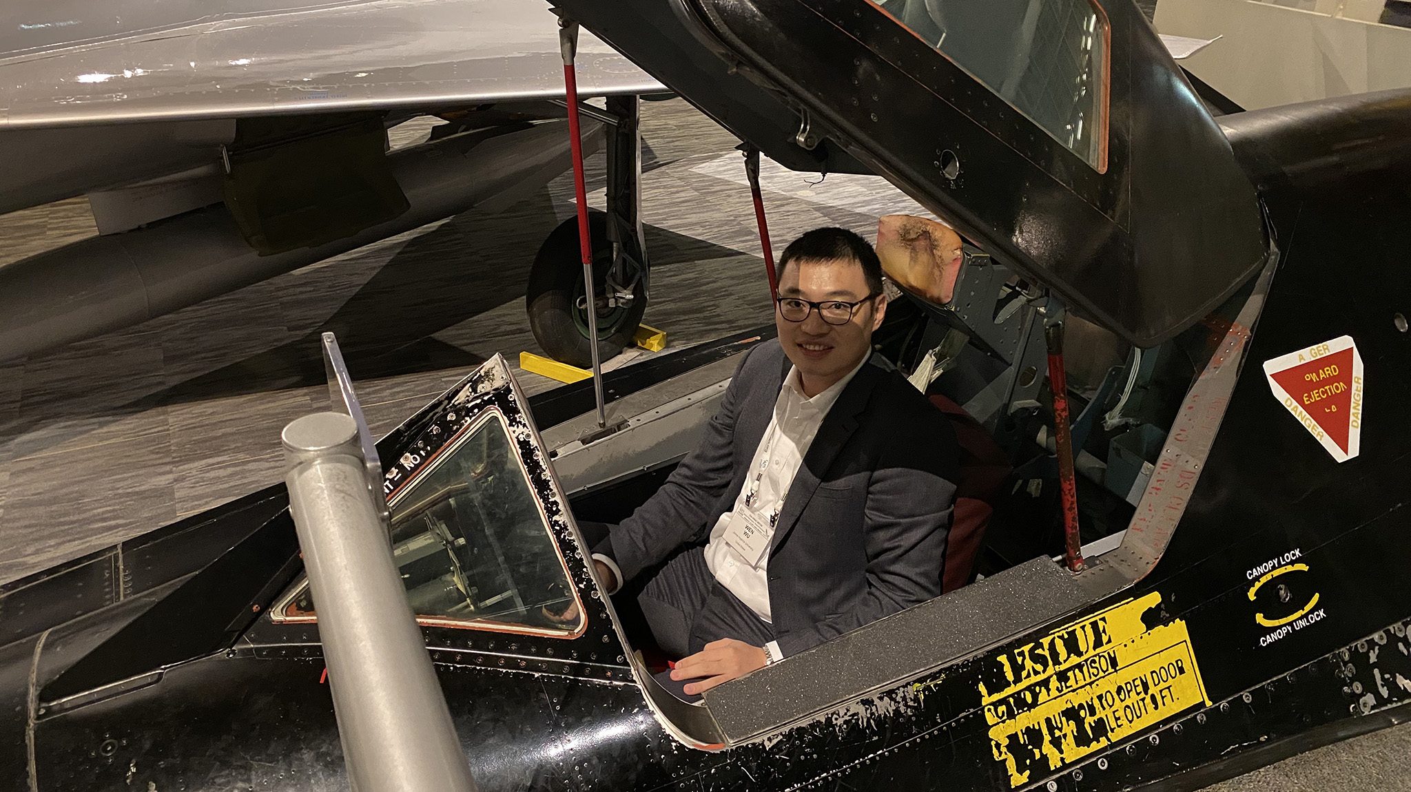 Wen Wu, assistant professor of mechanical engineering at the University of Mississippi, sits inside a showroom vehicle during the 2019 annual meeting of the American Physical Society, Division of Fluid Dynamics, in Seattle. Submitted photo