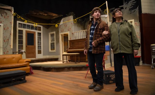 Freshman Maxwell Glasser (bottom) plays the piano while professor emerita René Pulliam, playing Sadie, looks on in a scene from the world premiere play ‘Hazel.’ Photo by Kevin Bain/Ole Miss Digital Imaging Services