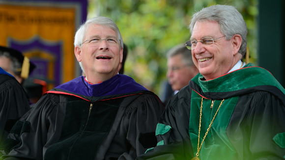 U.S. Sen. Roger F. Wicker (R-Miss) (left) and University of Mississippi Chancellor Dan Jones chat on the Grove stage as members of the Class of 2012 file into their seats Saturday morning. Wicker, who was elected to the Senate in 2008, delivered the university's 159th commencement address. UM photo by Robert Jordan.