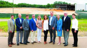Gathering at the construction site of the South Campus Recreation Facility where the William Magee Center for Wellness Education will be housed are (from left) Brett Barefoot, UM development officer for parents and family leadership; Billy Young, co-founder and CEO, Dr. Stephen Pannel, medical director from the AAC-owned Oxford Treatment Center; Jay and Cris Hughes, Kent and David Magee, and Diane and Dick Scruggs, all donors; and Brandi Hephner LaBanc, vice chancellor for student affairs. UM photo by Bill Dabney